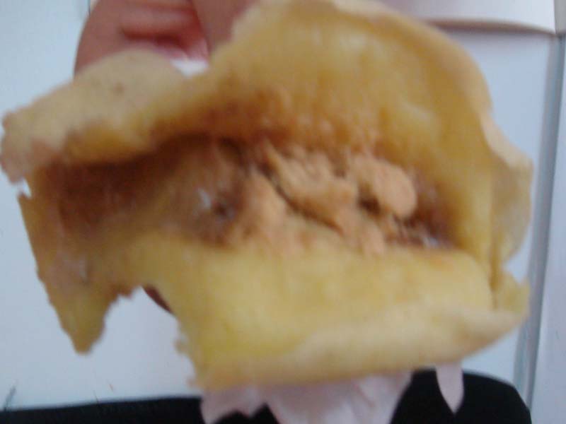 这是蛋烘糕的成品,看起来虽然不怎么样,但是味道却是一流的。黄黄的饼子夹杂着酥嫩的牛肉松以及香甜的巧克力奶油,相信一定会美味的。
