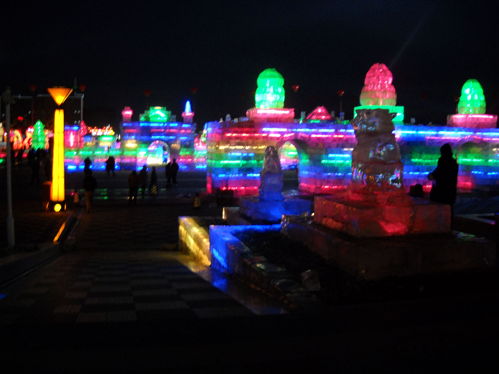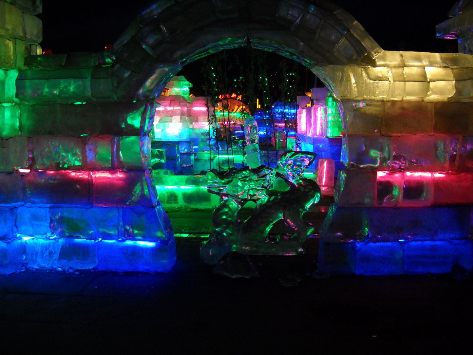 往里走,就是美丽的冰灯了,它们玲珑剔透,散出五颜六色的光。那些冰雕巧匠们,用一块块冰砖筑成了一个个冰堡,每个冰堡的形状不一样,每个冰堡层的颜色都不同,你穿梭在其中,好象进入了仙境一般。