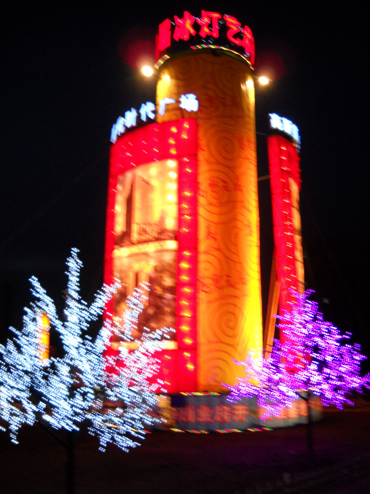 首先,映入眼帘的是一个擎天的灯柱,上面写着“高新区第二届冰灯艺术节”,闪烁着红光,十分夺目,四周有许多五彩缤纷的灯树,美极了。