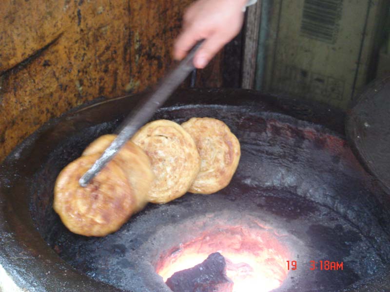 最后一道工序也是最重要的一道工序,锅魁质量的好坏全在于最后的这一“烘”。已经剪得差不多的锅魁放入锅底用火烘,使锅魁变得酥脆爽口。大致几分钟,锅魁就可以出炉了。