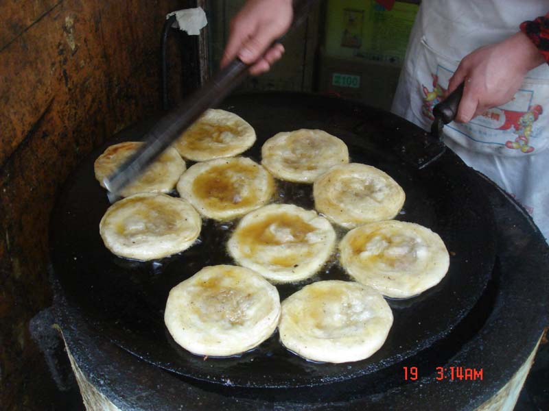 这时将擀好的棉饼放入锅中,开始用油煎,等到面饼成黄色时,饼就已经熟了,但此时千万不要忙与起锅。还有最后一道工序。