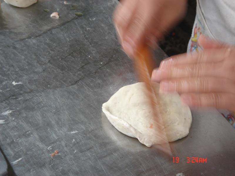 接着用擀面杖将裹好的面团擀成面饼。这时,锅魁的制作已经完成了一半。只等着下锅了。