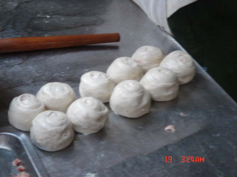 制作锅魁的第一步曲:先将大面团分成小面团,并且用手将面团搓成圆形。并在搓好的面团上抹上香油。