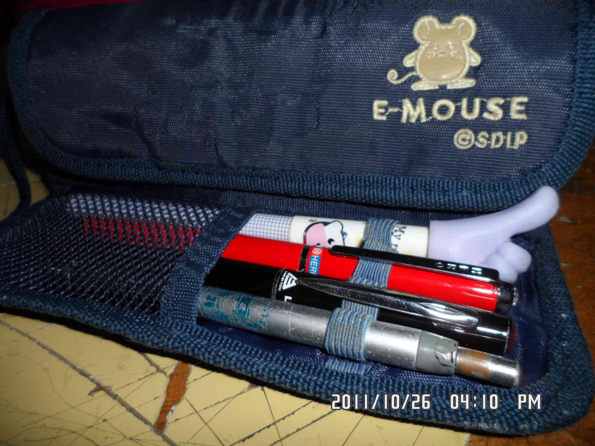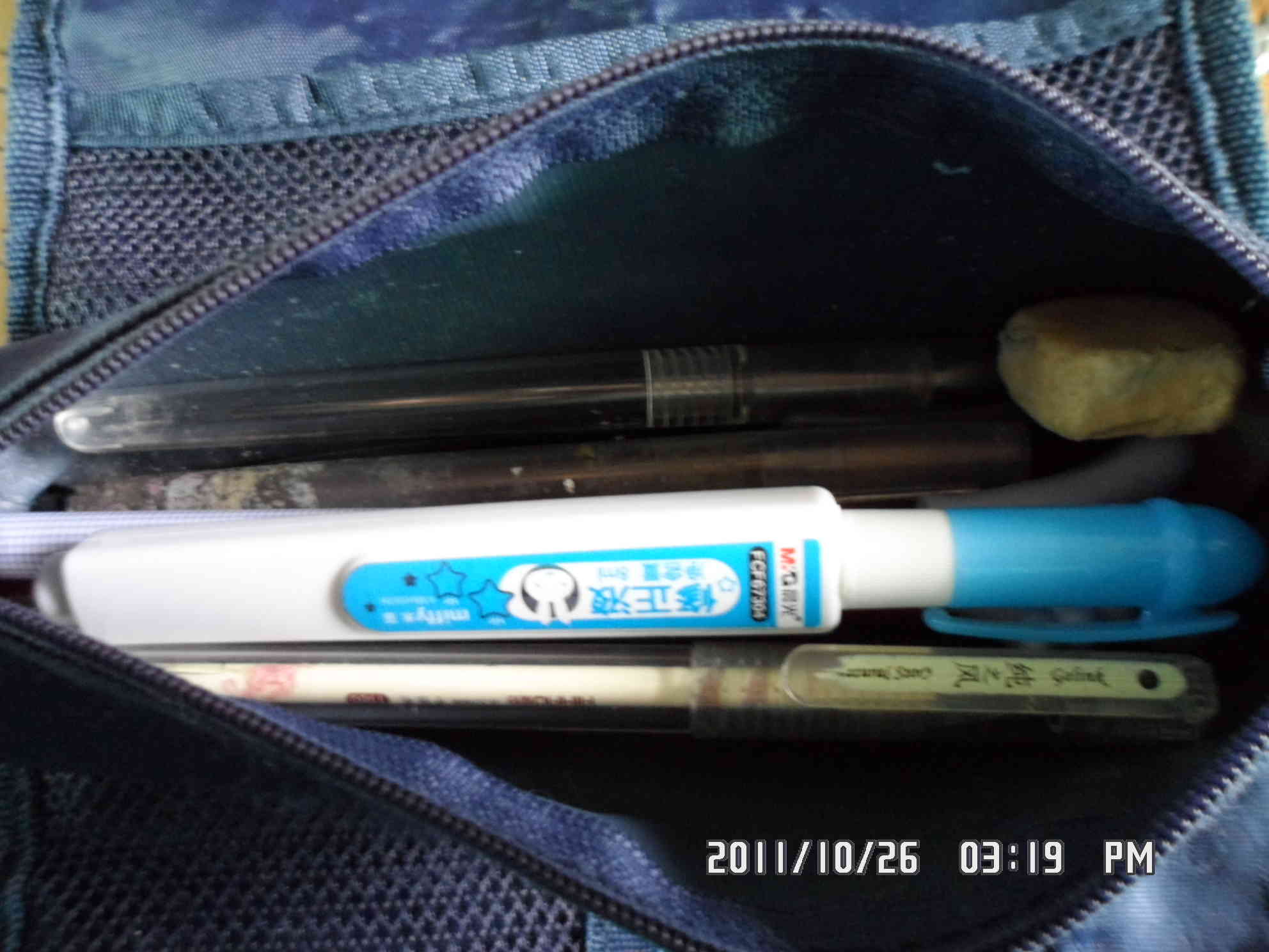 打开笔袋,里面有两个小袋子,下边有一个蓝色的“小窗帘”。打开这“小窗帘”,噢!我的“小助手们”正在香甜的睡大觉呢!有橡皮擦、修正液、钢笔、铅笔……它们已经劳累一天了,让它们好好休息吧!