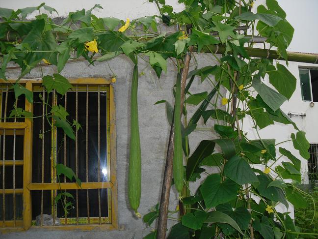 小家伙昂首挺胸地被挂在瓜藤上,仿佛在向人们炫耀他那一身绿色的新衣似的。本应被挂栽在菜园子里的他们现在却被人们请到了花台里。我想,他们刚来时可能伤心过,绝望过。后来却习惯了,或许他们也明白这样一句话“我改变不了环境,但我可以改变自己”所以他们一如既往的把果实送给大家。
