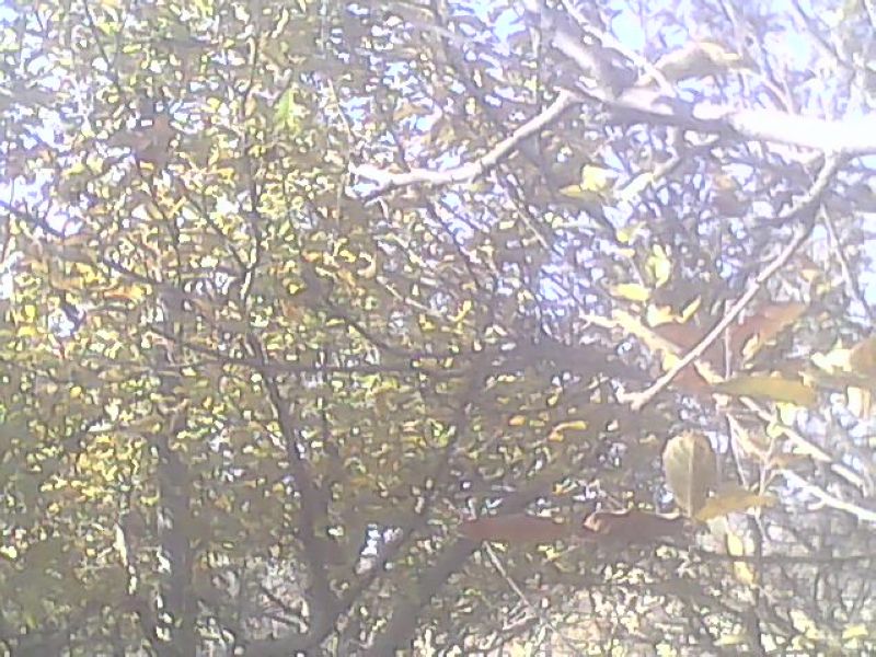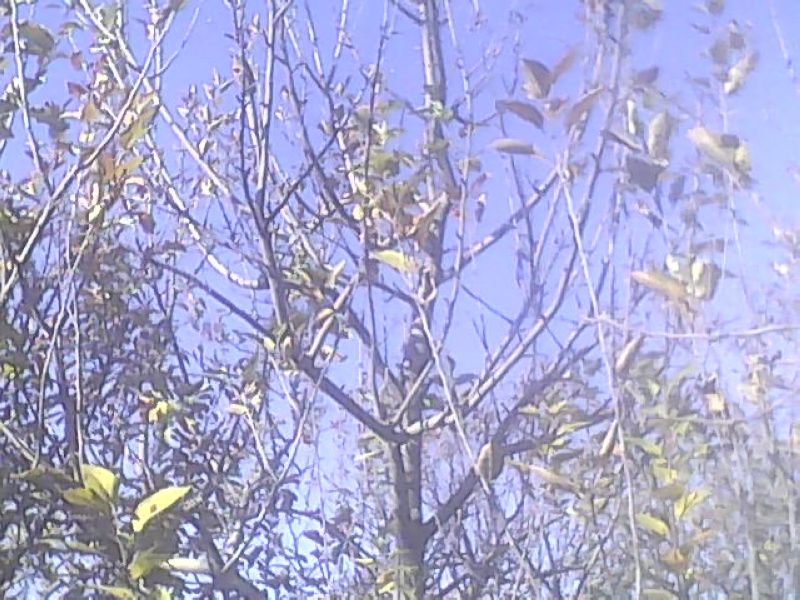 现在已是深秋,是农闲的时节,田野、树梢上望去光秃秃一片,果园里的树叶大部分都落光了。但是还有几棵树上的叶子还在勉强支撑着。现在的果园已经不能再叫果园了,简直成了‘荒地\'。