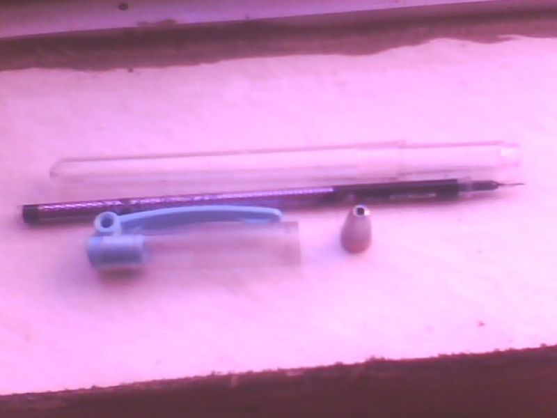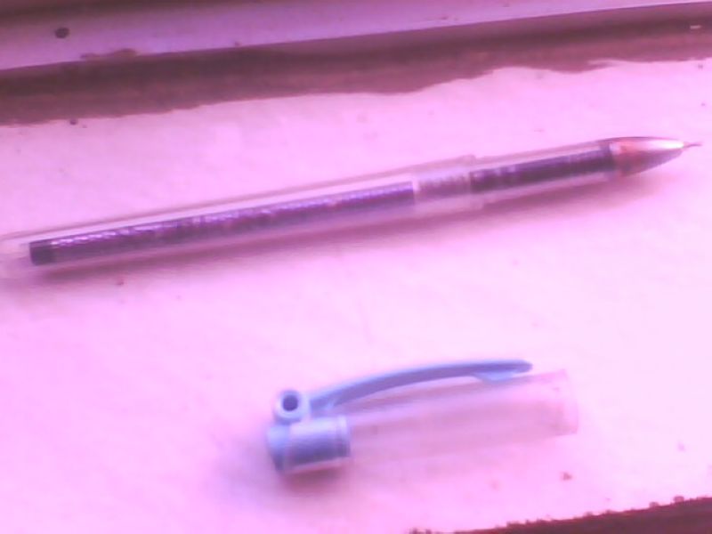 旋开内盖,就会看到笔内部的全貌。拿着笔嘴,从笔里抽出一支细长的管子。这根管子跟笔嘴连成一体叫笔芯。在笔芯里装的是油墨,油墨量的多少决定了笔芯的寿命。但油墨用光时,笔芯也就报废了。