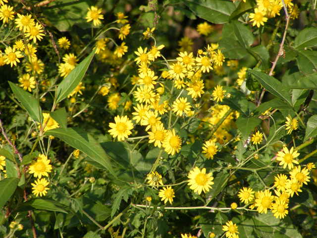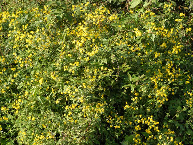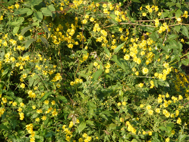九月中旬,正是金菊花盛开的旺季,走到田间,到处都能看到金灿灿的,一簇一簇的野花。它的色彩是金黄色的,一般的都有十二三片的花瓣儿。