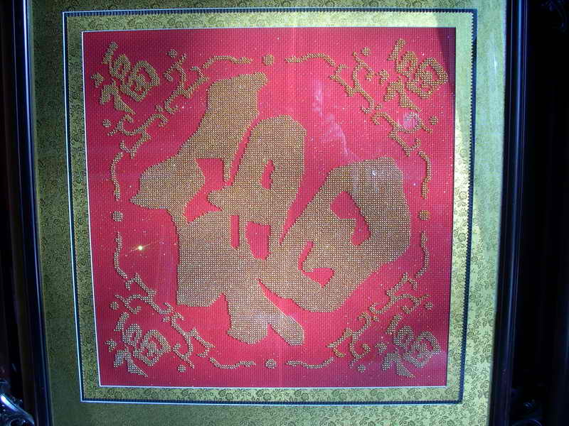 今天经过这里的时候,突然看到这个“福”字,一下子眼前一亮。细密的针脚,紧凑的布局,鲜亮的颜色,顿时让人觉得震撼。总以为刺绣这样的“巧活儿”是世世代代生活在江南一带的依依小女人们做的工艺品,西北的土地上,粗犷的北风,吹不出那样细柔的心。当我看到这幅作品的刺绣的时候,便再也没有了那样的想法