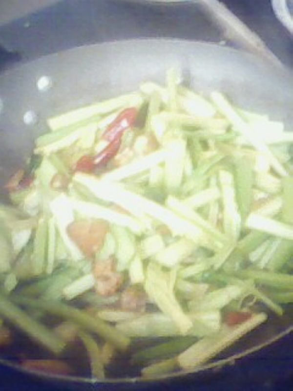 最后是炒菜,先把油倒上,等油开来,把肉慢慢从锅边放下,把肉炒到三分熟时,再将芹菜倒入,放调料是最主要的,要调整各比例,才能一齐混合炒,过二十分钟,一盘热腾腾的美味就桌了.