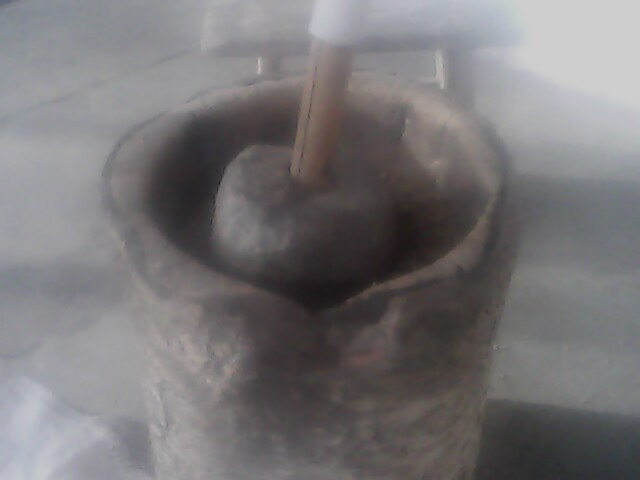 首先把一碗小麦 倒在小盆子里,用温水 泡半个多小时,再到出来使水份完全蒸发后,放进用木头做的木头敦里,当然它里面是 空心的,再用石头杵把它捣上二十多分钟,就先看到小麦上面毛茸茸的一层,这还没好呢,再用力狠狠的捣上四十多分钟,可以看到小麦皮完全脱落了下来,石头杵上沾满了麦片,用嘴一吹飘飞起来了,木头敦的周围也落了厚厚的一层,用手摸摸软的像鹅毛……