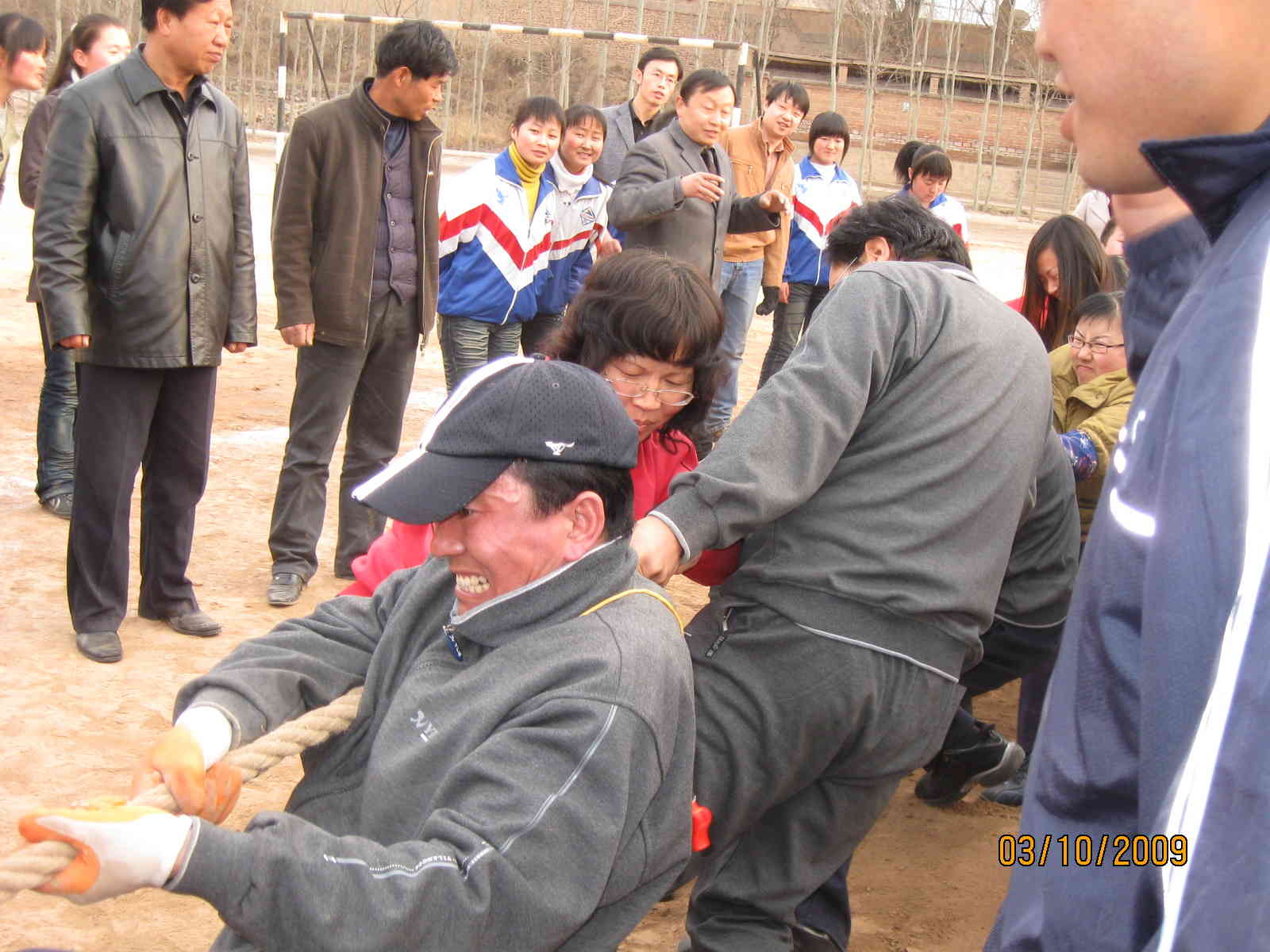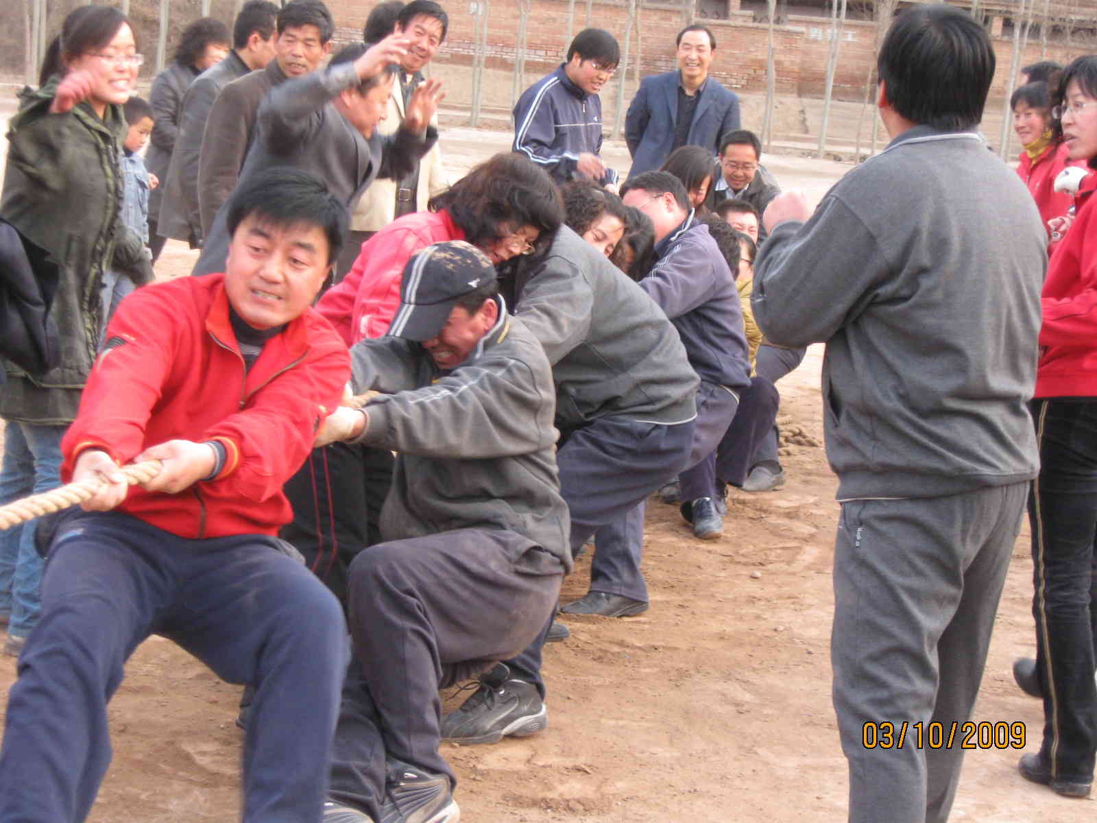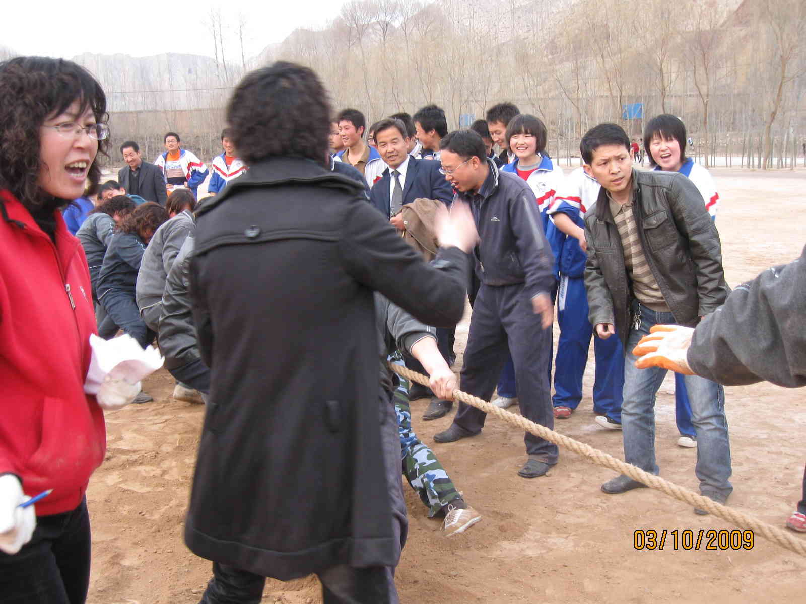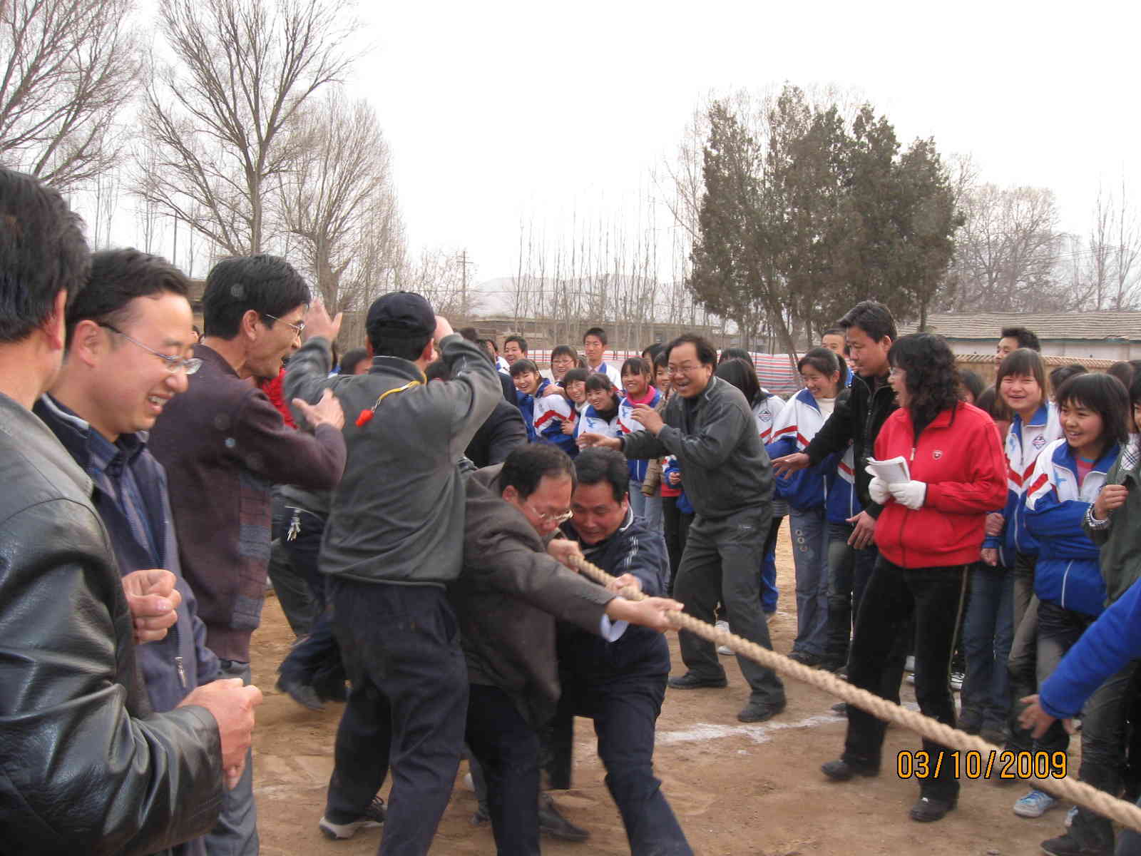 在当后勤赢了我们高二年级组的老师之后,那气氛高涨啊!于是,第二场比赛开始了。这一场是该一年级组对高三年级组,高一年级组的老师们都高瘦高瘦的,高三的则是很强壮,我们就想也许这一场高三会赢吧!结果,高三胜利了。比赛迎来了高潮,最后一场的是冠军争夺赛。是后勤与高三年级组对决。一声哨响,比赛开始了,两边的人员全都用力的拉着,加油声一声比一声高,身子一会儿往右走,一会儿又往左走,谁都不愿让那绳子往对方那边过去。最后高三年级组以绝对的强势赢得了这场比赛,后来我们大家都为高三年级组的老师们鼓掌祝贺。