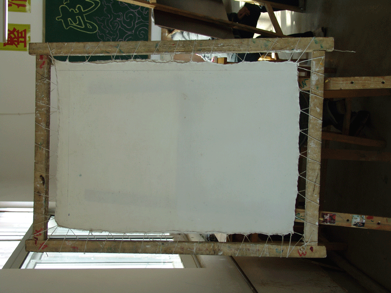 选好了画布就要进行画布的绷展。先将画布裁好后洗净、凉干,后把画布绷在绷架上。绷制画布时按照绷棍的粗细,四周留出一寸至两寸宽窄的画边,将其折成卷边,穿入绷棍,将画布绷展。