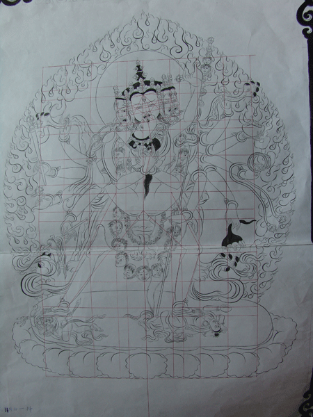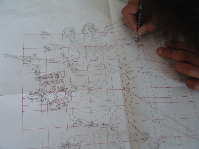 介绍完了绘制唐卡所用的用料及工具后,现在就给大家介绍一下唐卡的基本制作方法。前面给大家介绍时已说明在制作唐卡时讲究度量,所以在绘制唐卡前第一步就是度量,也就是说如何将图案均匀的画在画板上。当然这个也不是随意性的衡量,须掌握佛、菩萨、护法神等的造型规律和造型方法,和基础绘画一样塑造形象要依据确定相应的尺度和比例。