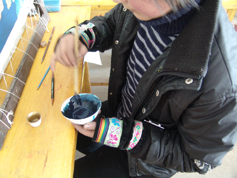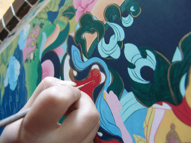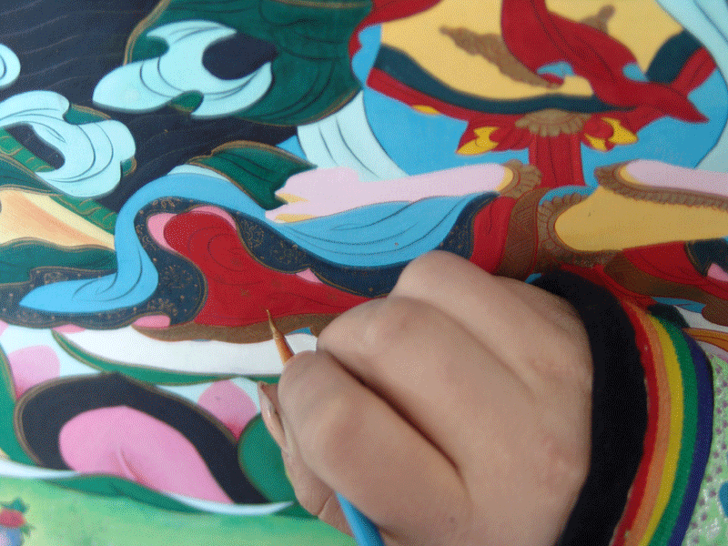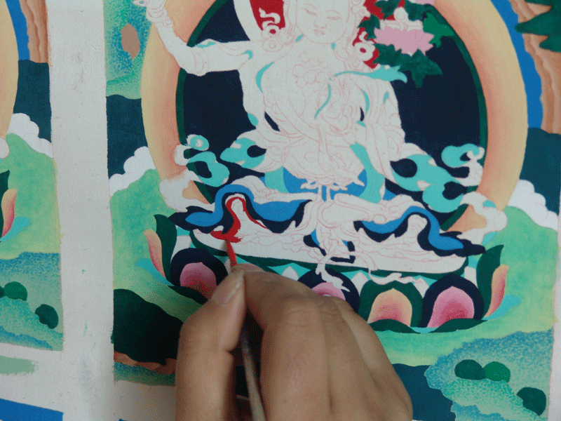 基本的唐卡成型后就得上色,其步骤为一为颜料调制,此步骤也是一幅唐卡成功与否的关键。在绘制唐喀画的颜料质地一定要质优量足,调制时要按照传统方法进行研磨,后加少量胶汁泡制一天,加温后就可上色。但须注意的是:有如把矿物颜料和动、植物颜料随意配制,就会产生腐败现象。