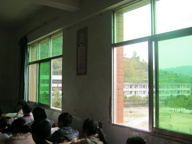 现在,同学们在教室外边正对里看,首先你的眼球那会被那充满绿的窗帘吸引。