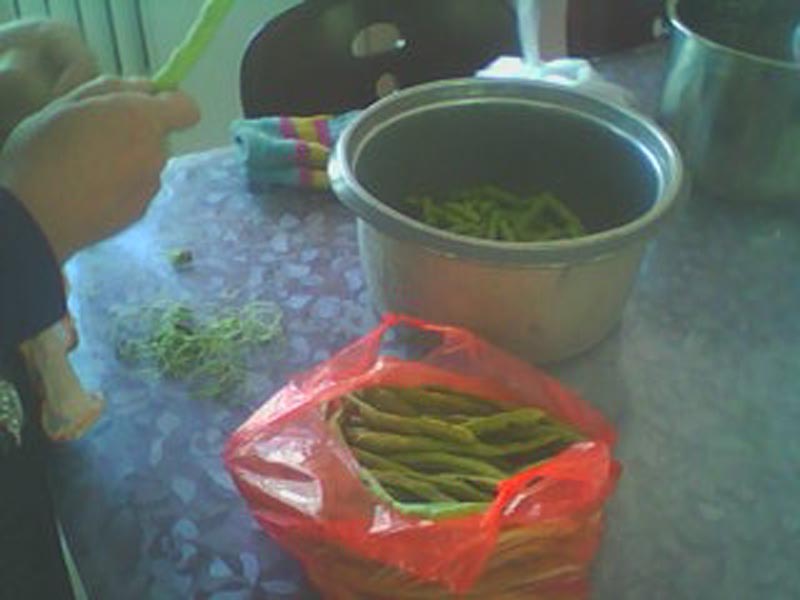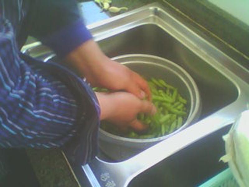 再把准备好了的豆角和土豆放在水盆里洗干净,不能有一点儿泥点。