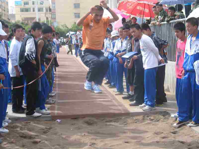 在跳远赛场上,只见一名运动员疾速助跑,快到界线时,纵身一跃,身体前倾,在空中划过一道优美的弧线,双脚落地,一个不错的成绩,同学们为他欢呼,鼓掌。这股热闹的气氛鼓舞了比赛的每一个运动员,又一个身轻如燕的运动员上场了,他先慢慢地跑起来,跑到中间位置时,他用力踩了一上“油门”快速腾起,又一个优秀的成绩展现在人们面前,现场又一阵欢呼,还未比赛的运动员个个信心饱满,整装待发。