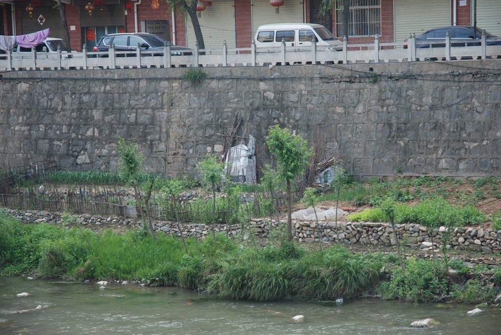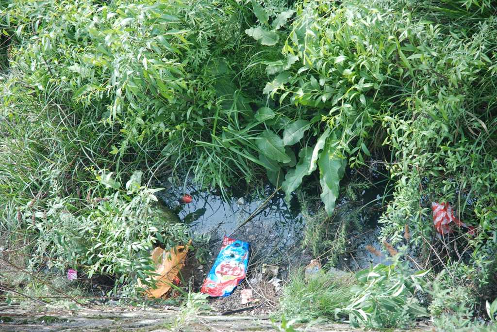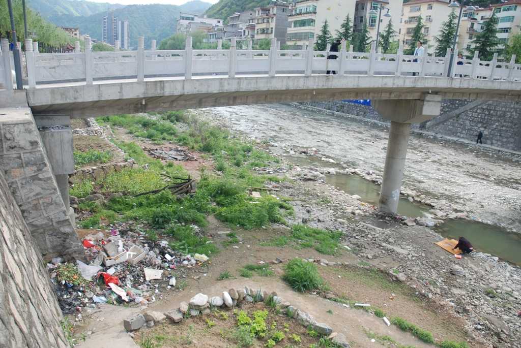 这是乾佑中学校门外的一条小河,一些小草遍布在小河的一岸,一堆十分显眼的垃圾扎在小草的旁边,而旁边的小方池曾经养过鱼,鱼鳞顺水而下。
