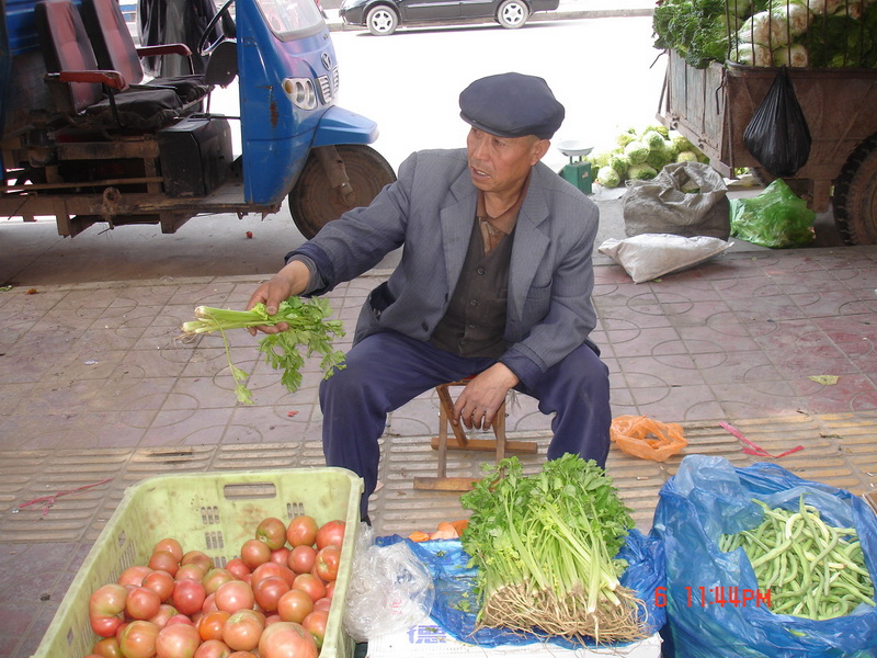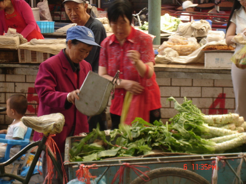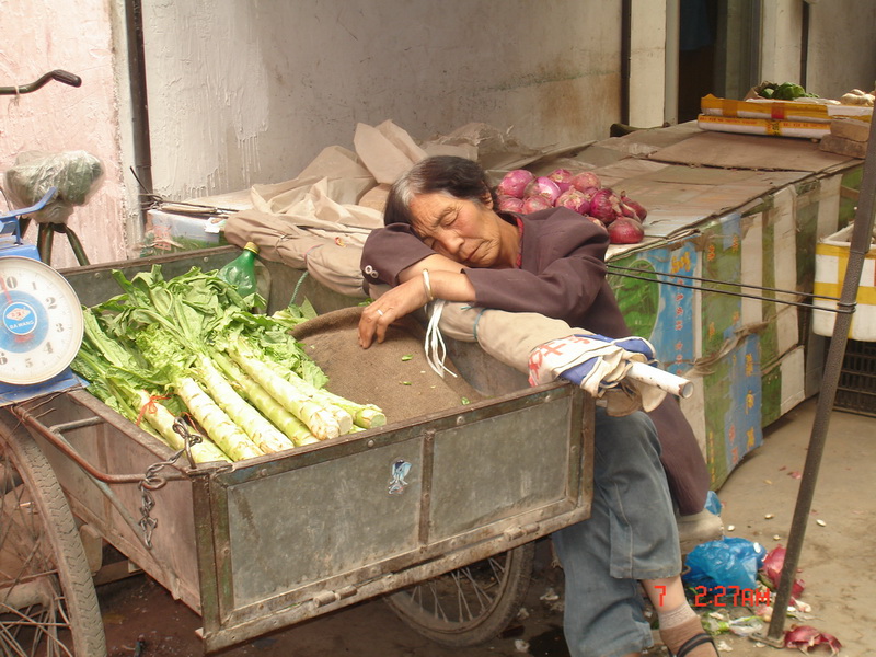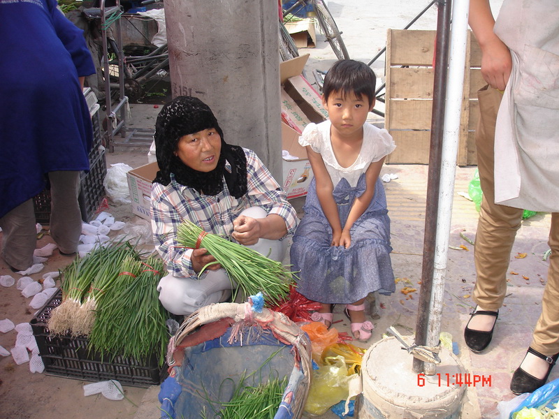 但在看到今天这一幕之前,我却无法真正了解这些葱农的心酸。照片右边的小姑娘是她旁边这个妇女的孙女。因为家里没有人照看,她必须自己的小孙女带在身边。她们拿着早上刚从地里摘来的新鲜的葱,在拥挤的过道里叫卖。葱一捆一捆得安放在还带着泥土芬芳的菜篮里。我看着她们周围开始有了好多买主,我安安静静离开了……