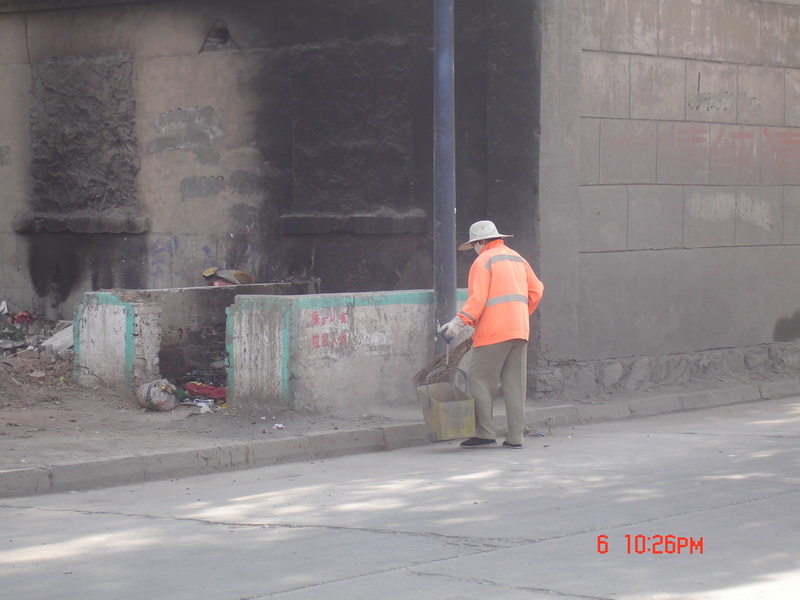 焚烧得黑黢黢的垃圾堆旁,有一位穿着橘黄色长衫的清洁工人,她一遍一遍清扫着路两边藏在缝隙里的脏东西。我上前去问她,是几点出来这样扫的,她擦了把汗,微笑着说:“早上5点就出来了……”我突然心里一震,我看着她布满皱纹的脸,突然能够想到她每天天不亮的时候就出来打扫,一直到烈日当头的时候携着疲倦的身体回去。
