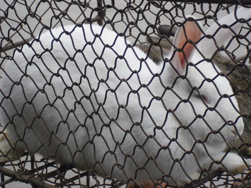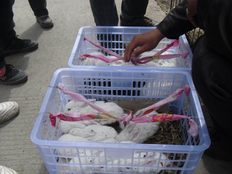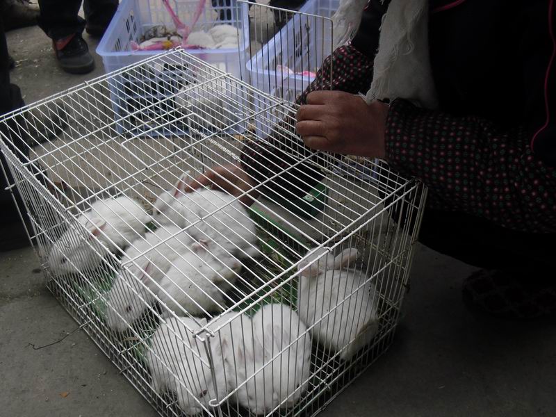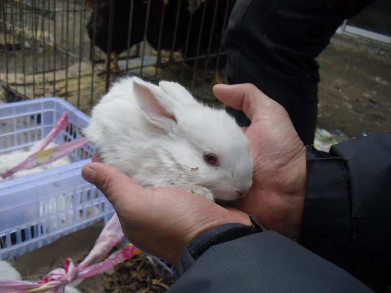 正在我享受的时候,我发现小兔子不对劲,它没精打采的,再看看旁边篮子里的兔子们也是这样。也许它们还没有吃早饭,就被拉到这里来卖了。想到这里,我觉得可爱小兔子也挺悲惨的。