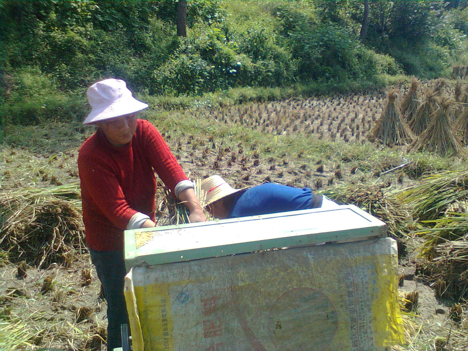 起上一个艳阳天,就要赶紧扛上打谷机,却田里收稻谷了。由于地处偏远山村,而且田地很零散,至今我们仍使用着一种传统的机器打谷子,需要人用镰刀先割下稻谷草,然后拿到打谷机上,高速飞转的轮机粗略地将谷粒从草尖上刷下,混杂着稻叶和谷茎,一把一把地把劳动成果装进口袋,再运输到家中晾谷场晾晒。