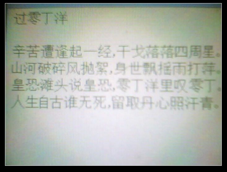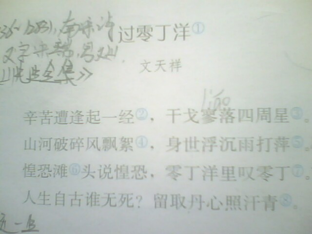 诗的内容是这样的:"辛苦遭逢起一经,干戈寥落四周星.山河破碎风飘絮,身世浮沉雨打萍.惶恐滩头说惶恐,零丁洋里叹零丁.人生自古谁无死?留取丹心照汗青."此诗写于诗人被浮期间,他寒窗苦读,满怀激情参加科举考试,却在战斗中度过了四个春秋.那时的他已和国家紧密相连,剩下的只有叹息声了.他并没有改变一个王朝的命运,但他却留下了"人生自古谁无死?留取丹心照汗青"的豪言壮语.那份对国家的炽爱溢于言表.
