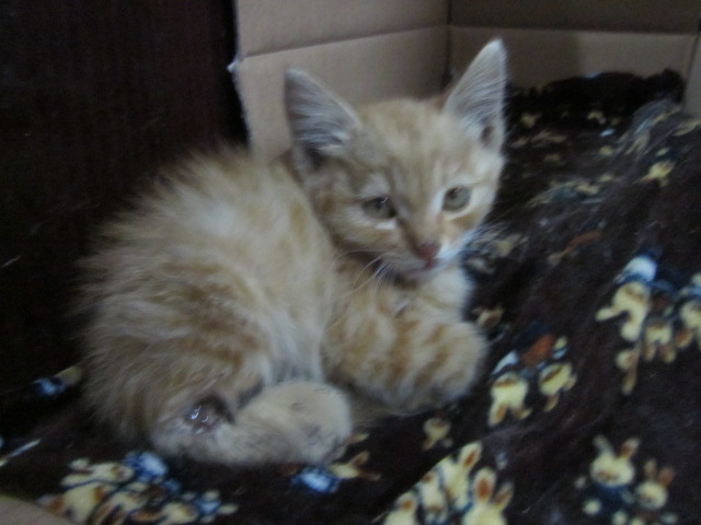 大概过了两周,星期天返校的时候,远远地我就看到了最小的那只小猫,蹲在学校门口。我想它肯定是饿坏了,在那里等我。我跑过去拿了点从家里带的馍馍给它,它喵喵的叫着,却不肯过来。我仔细一看,原来它的后腿受伤了,蹲着的地方,已经流了很多血。