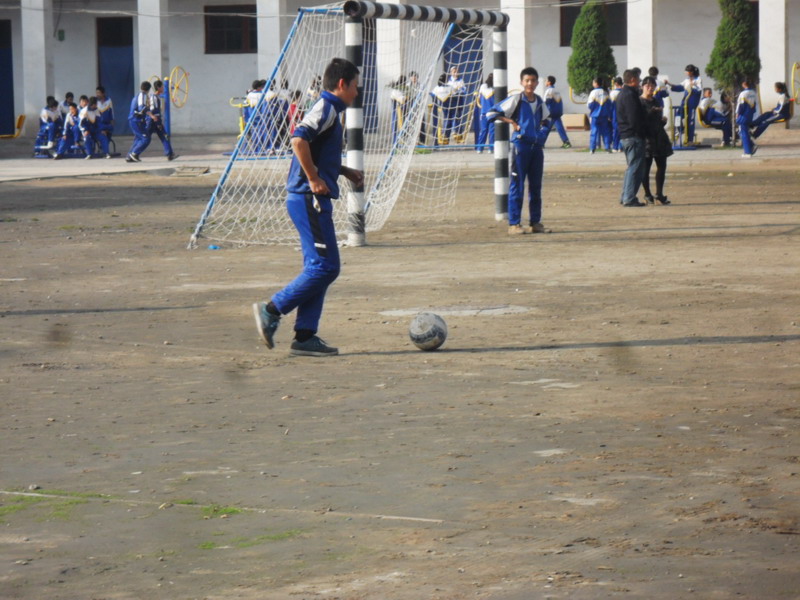 刚走到操场,首先映入眼帘的是足球运动。瞧,他们在那儿踢得正起劲呢,一会儿传球,一会儿拦截,一会儿射门,一会儿又来一个飞射,看得的观战者们惊叫连连,目瞪口呆。哇!初三的那名学长一脚来了个飞射,那个足球便顺势腾空而起,在半空中划过一条优美的弧线后落地了。这一完美的动作引得一旁观战的人连连叫好。