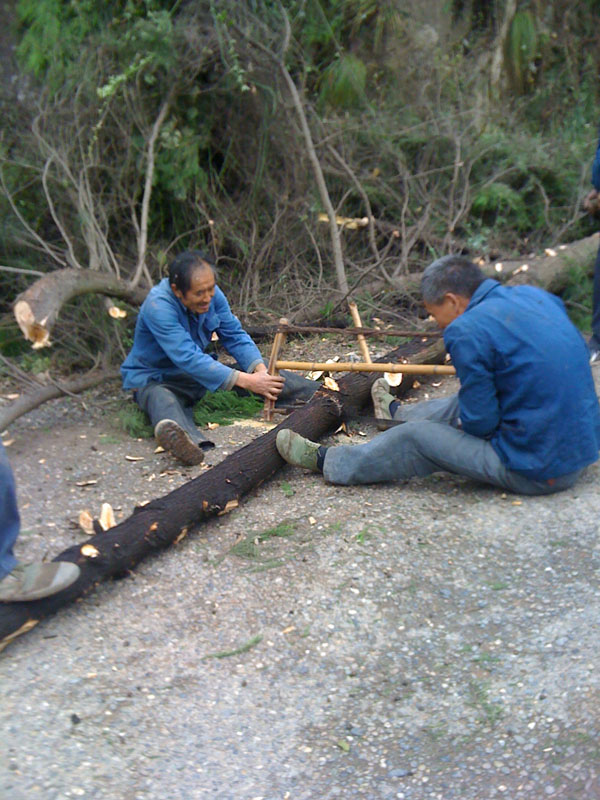 今天天气还不错。刘爷爷叫了几个人帮忙,一起到上山去伐木,就是为了给新盖的房子搭房梁柱。虽然树不是多么的大,但它足够的直,所以很容易就被爷爷选中了。几个老人把树抬到公路上,锯成长短一样大小,然后一起搬回家盖新房子。