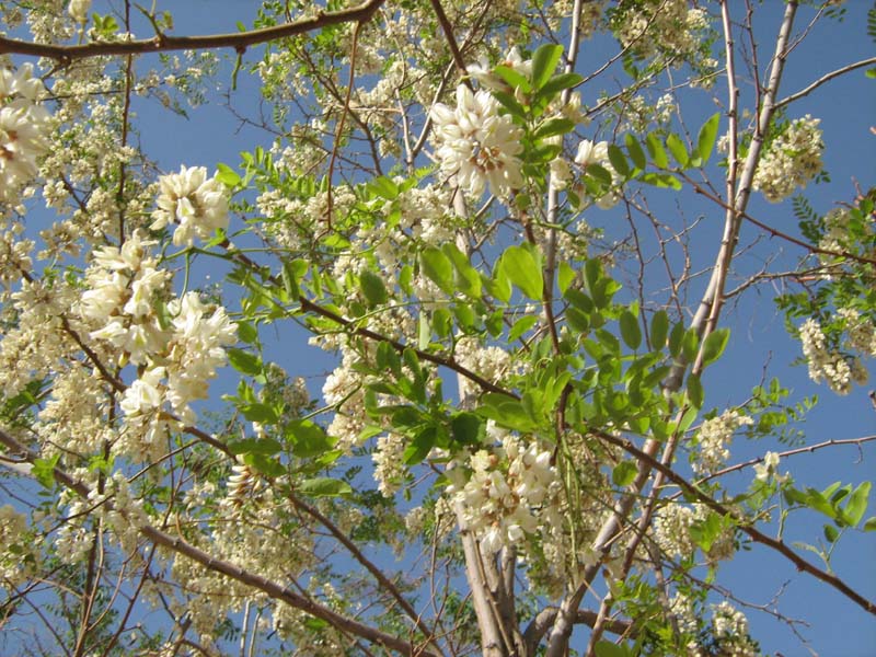 槐花是一种可以食用的花,采摘后,用清水冲洗花苞三四遍后把水份凉的半成干。然后用面粉均匀的洒在上面用手搅拌。蒸制半小时后,就可以吃了。五月中下旬后,槐树花就自然凋谢了,随着天气逐渐炎热,槐树便伸展开它的枝叶,茂密的生长了。