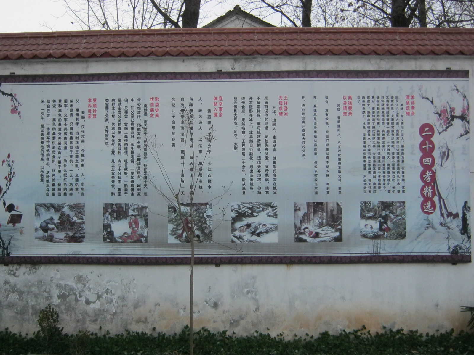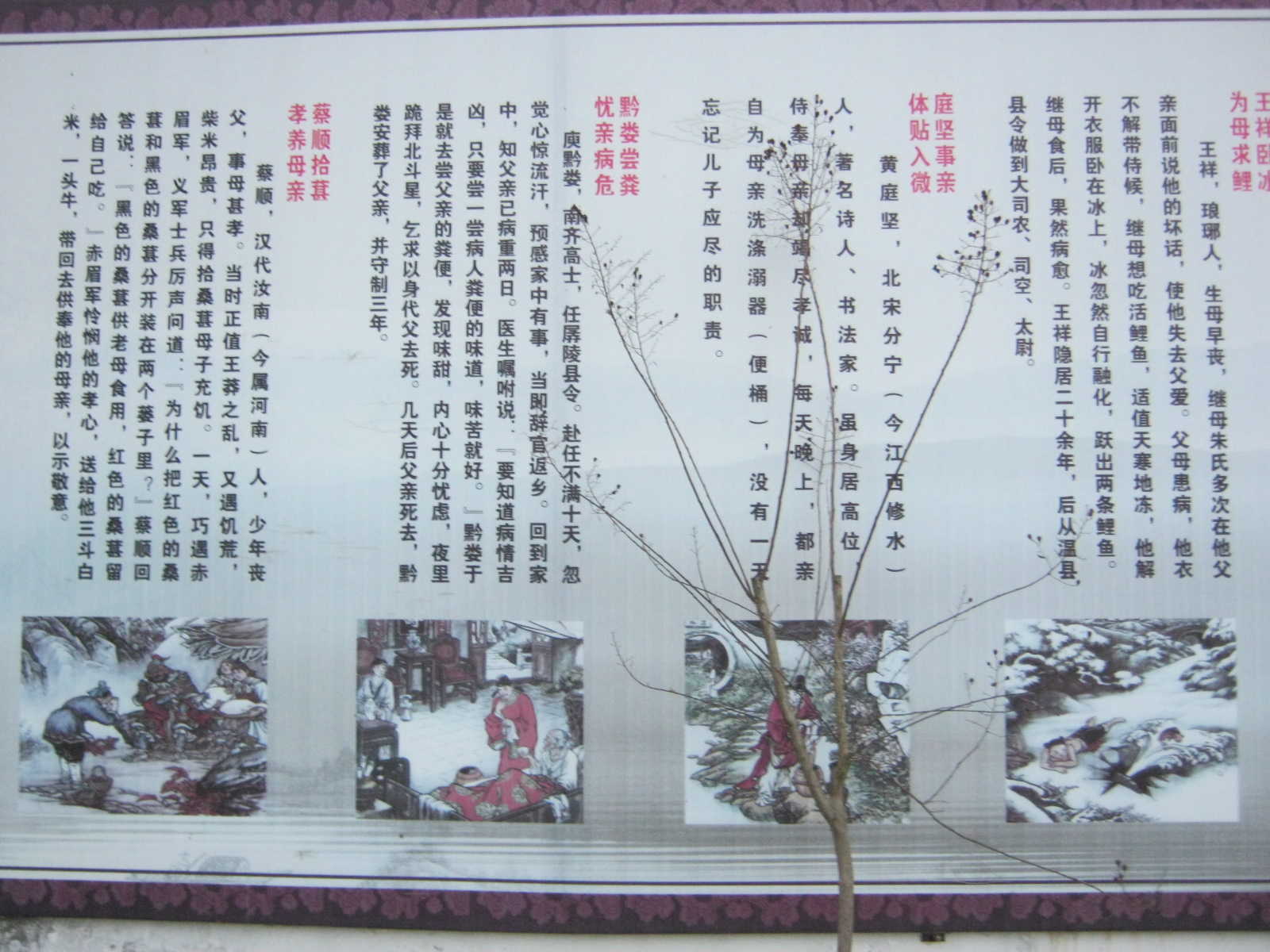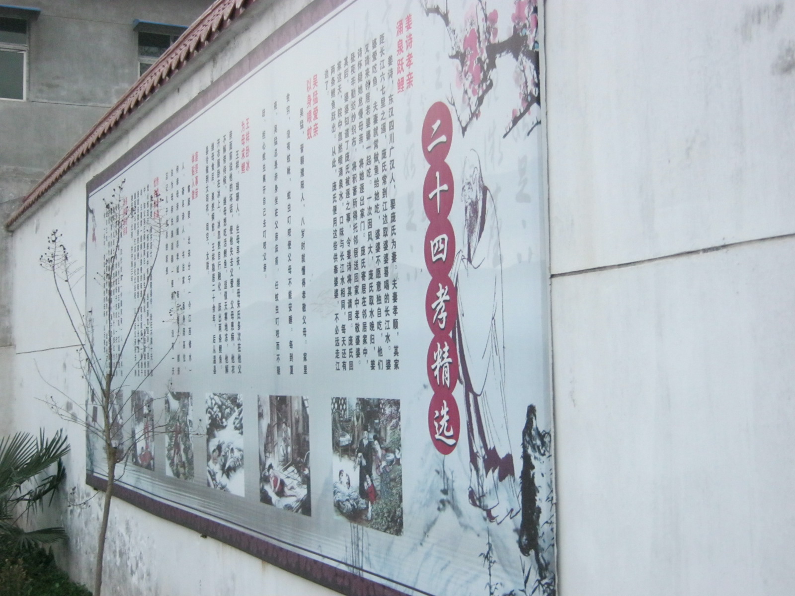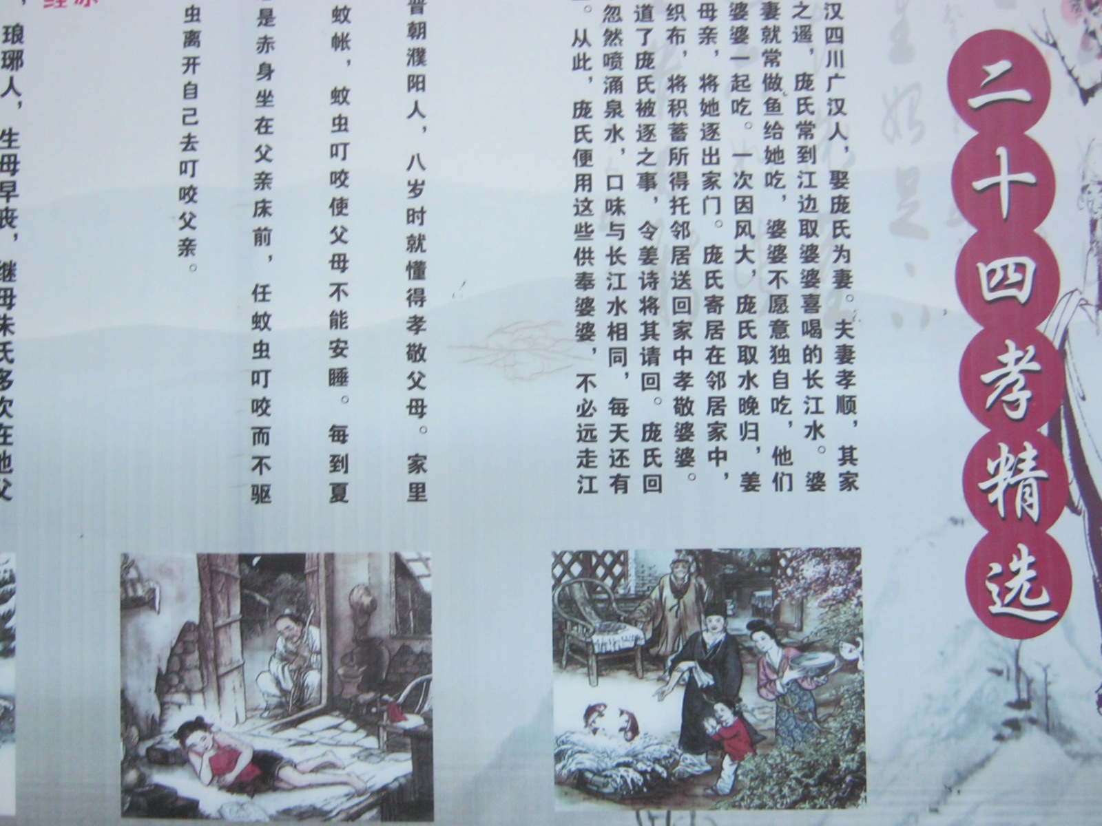 学校“二十四孝精选”的展板共有六个故事,在这“二十四孝精选”中我最喜欢第一个故事《姜诗孝亲,涌泉跃鲤》了,它讲述了汉代姜诗与妻子的孝行。听老师说其实《姜诗孝亲,涌泉跃鲤》是《二十四孝》中的第十则故事,他最喜欢这篇,就把它排在了第一。