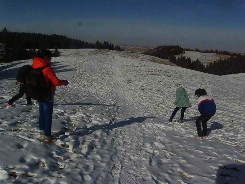 走过这段小道,翻过陡峭的山岭,眼前是一片宽阔的平原。古人说得好“站得高,看得远”,一切美景尽收眼前,周围连绵不断的山似乎少了许多。下雪时,我们在这里打雪仗,或追逐打闹,那欢声笑语在空旷的平原上回荡,使孤寂的山活了过来。