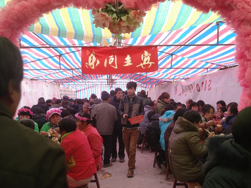 早在三天前,主家就开始通知外地工作打工的乡亲回家、村中的男女老少来帮忙,晚上就设宴款待帮忙的乡亲。现在帮忙是比较简单的,桌子凳子、碟子碗筷、音响设备、门头狮子等等都是租赁的,不像原来需要在村中一家一家的借。乡亲们来主要是为烘托一个人气。