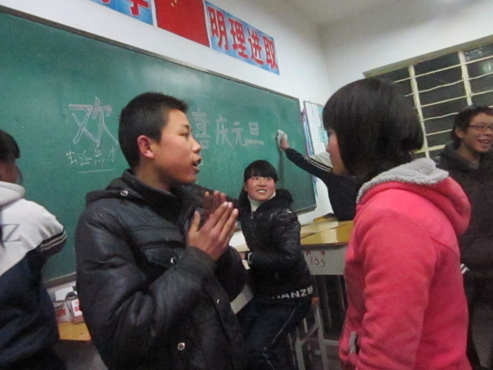 大家听见要开联欢会,二话不说,马上分工:班干部买东西,一组黑板报,二、三组的装扮教室,四组的负责请嘉宾。同学们真有想象力,把教室装扮的很漂亮,像新房一样,很有过年的味道。