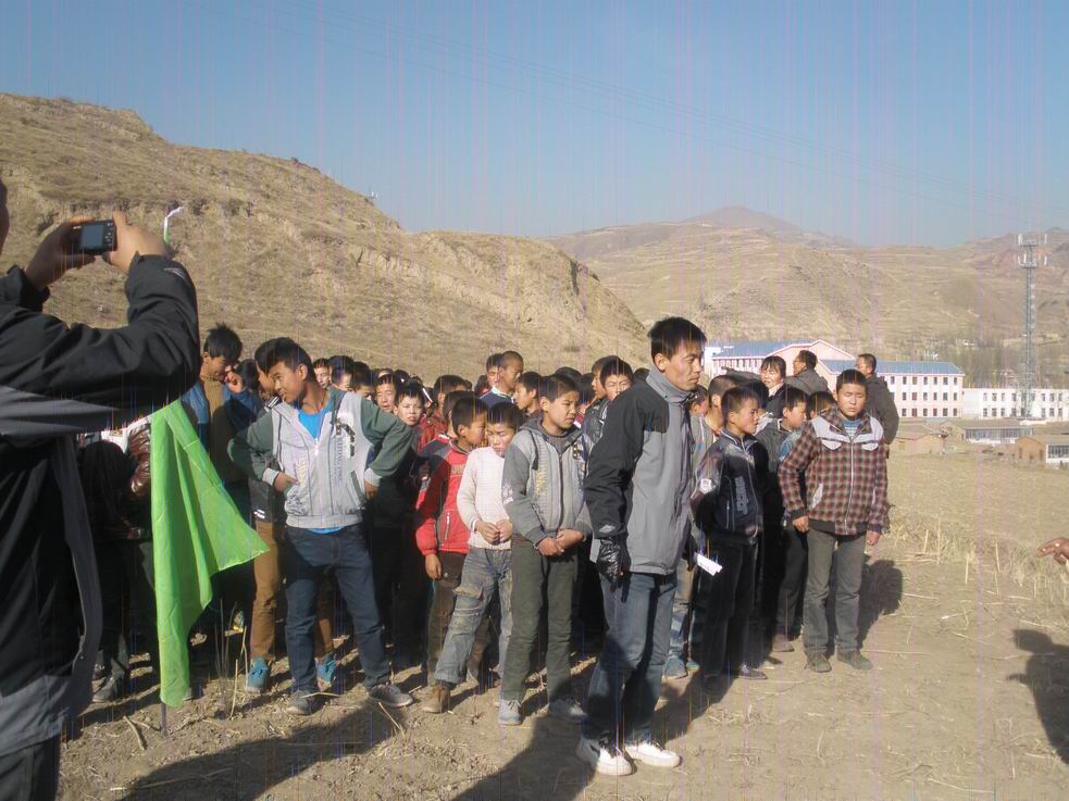 同学们一路小跑来到了山脚下。老师将同学们分成男女两队,然后又将两队进行了分组:三四年级为一组,五六年级为一组,七、八、九年级为一组。一切准备工作就绪,就等着比赛了。