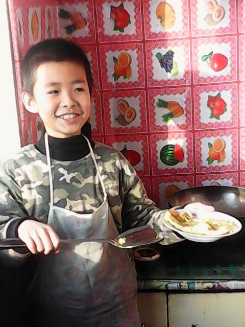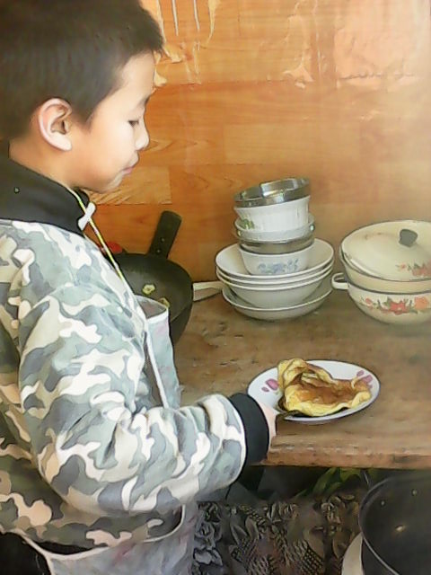 我起了床,想了想平时妈妈是怎样做早饭的,试着自己做早餐。我拿出鸡蛋和事先准备好的瓜子仁及洗好的蔬菜,然后将鸡蛋往碗口上一磕,没想到用力过猛将鸡蛋磕成了两半,洒了一地的蛋清。没办法我又拿了鸡蛋在碗口上轻轻磕,磕了好几下才磕开,再把蛋清和蛋黄用筷子搅了好久,打开电磁炉上锅烧油,等油冒烟了把鸡蛋倒进锅里煎了一会儿,然后把瓜子仁和蔬菜洒在凝固的鸡蛋上,我想翻面,可又出了状况,鸡蛋被铲子铲破了。这时爸爸下班了,我也顾不了那么多,把鸡蛋铲进盘子里。大声对爸爸说:"老爸,吃早咯!"爸爸疑惑地看着我:"你做的?"我自豪的点头。爸爸在房间里看了一圈,问:"妈妈没吗?"我摇摇头。爸爸突然抱起我,在我脸上亲了两口说:"儿子长大了,会给老爹做饭了."听了爸爸的话,我心里美滋滋的。