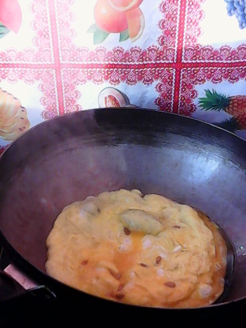 我拿出鸡蛋和事先准备好的瓜子仁和洗好的蔬菜,然后将鸡蛋往碗口上一磕,没想到用力过猛将鸡蛋磕成了两半,洒了一地的蛋清。没办法我又拿了鸡蛋在碗口上轻轻地磕,磕了好几下才磕开,再把蛋清和蛋黄用筷子搅了好久。打开电磁炉,上锅烧油。等油冒烟了把鸡蛋倒进锅里煎了一会儿,然后把瓜子仁和蔬菜洒在快凝固的鸡蛋上,我想翻面,可又出了状况,鸡蛋被铲子铲破了。