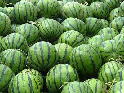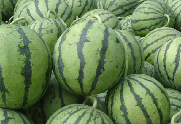 西瓜又叫寒瓜。颜色是青绿色的,又大又圆,皮上有的有纹路,瓜瓤有白有红,子有黄红黑白。二月下种,七八月份成熟,蔓生,花叶均似甜瓜。我每年都吃爷爷种植的纯天然的绿色西瓜。