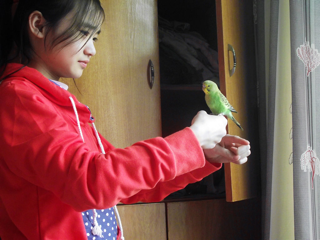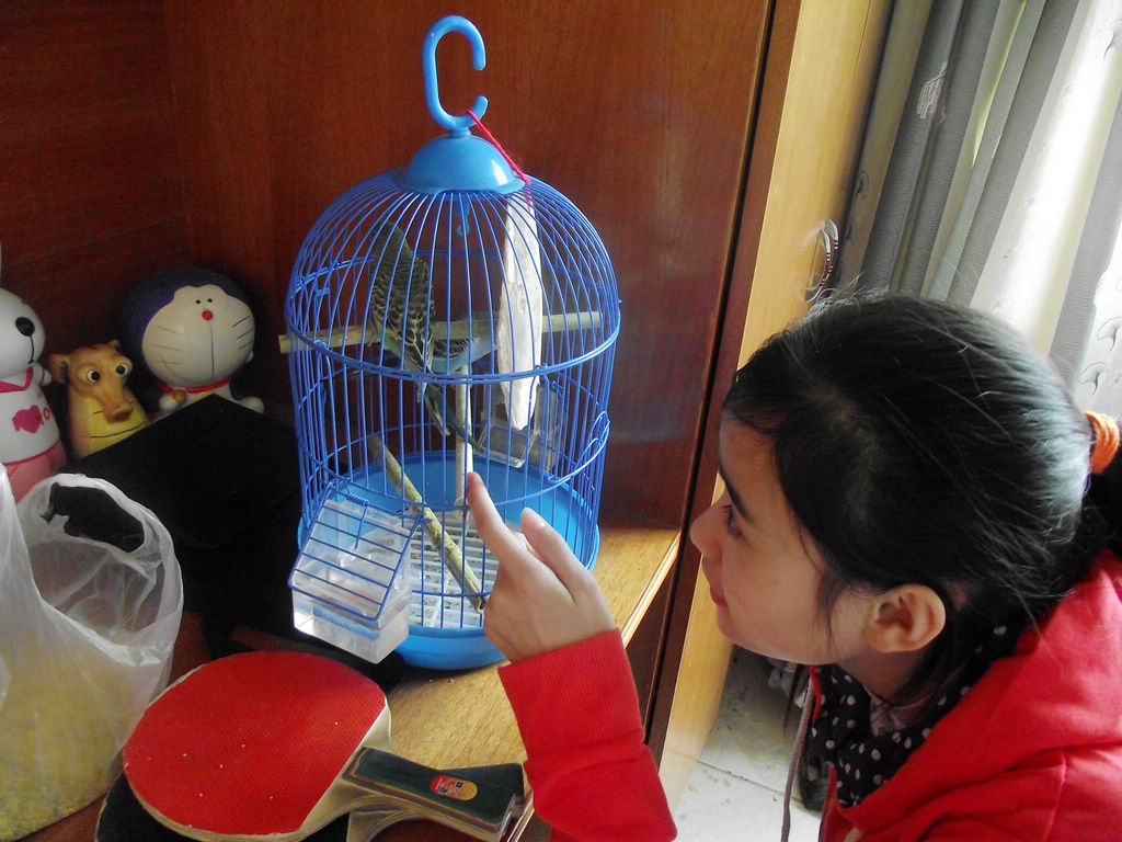 它们才买回来时,我一直以为蓝色的鹦鹉是雄性的,绿色的是雌性的。因为我觉得雌鸟应该要好看一些,可是动物世界里往往和人想象的不一样,有许多鸟类反而是公的好看些。因为我还不确定,就只有上网查一查了,可是按网上说的几种方法也很难分辨出来。后来,一次偶然的机会,我遇到了一位养虎皮鹦鹉的高手,终于弄清楚了。