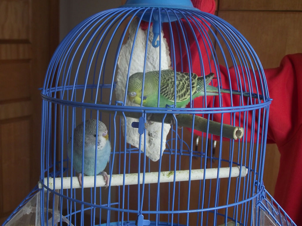 还有一件有趣的事就是一但把一只鹦鹉放出来,落了脚,它俩就会一唱一和的叫起来,仿佛在说"你在哪?"我在这儿"。如果两只鸟儿都出来了,那它们就"比翼双飞"了,并一起欢快地唱起歌来。