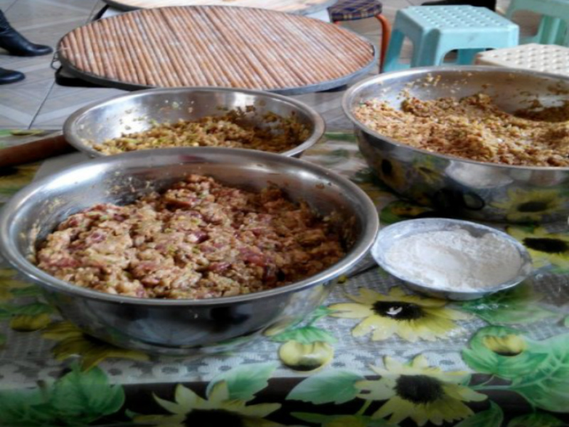 这一天我们家非常忙,一大早爸爸就忙着去贴对联供神,我和妈妈就在家包饺子。我抱着几颗大白菜洗干净,放在案板上剁碎,妈妈切肉炒肉。最后我们把碎白菜和肉浆和在一起,再切点葱姜蒜,放上盐、鸡精、大料把它们均匀地搅拌好。典型的猪肉大葱白菜陷就做好了。这是我们家乡家家户户的惯例饺子陷。