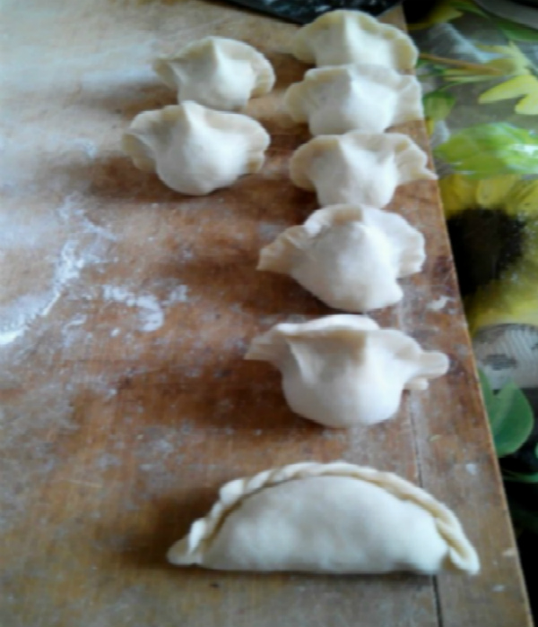 待妈妈捏好饺子皮,一切就绪。我们俩人就开工捏饺子了。白白的面皮放在手中央,右手挑起一满小勺饺子馅,包在面皮里,然后轻轻地将包满馅的面皮两端合拢,捏出纹路。一个小巧玲珑的饺子就成形了。