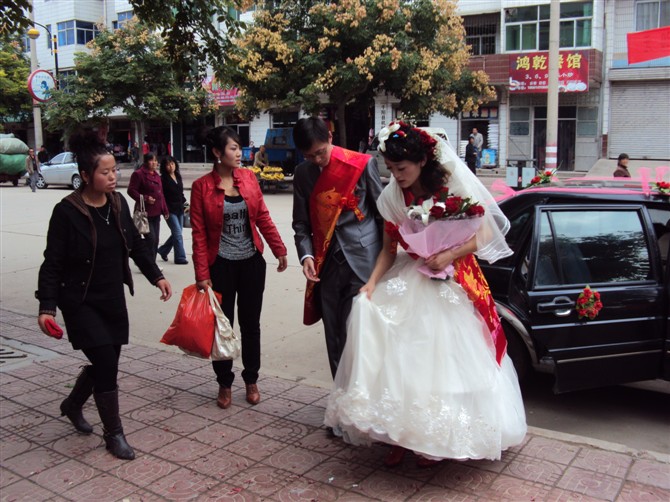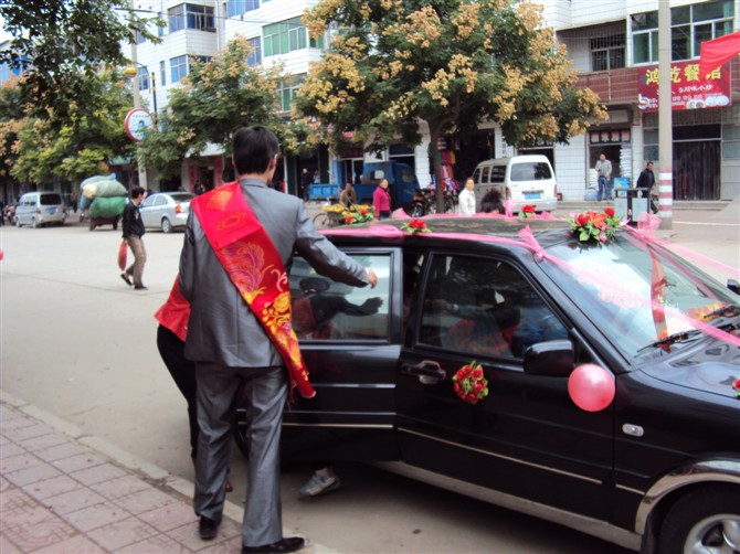 礼炮响了起来,新郎来了,可是房间的门却是关着的,可想而知里面的小伙子都等待着一个个的红包,新郎手里捧着一大朵耀眼的玫瑰象征着他们坚贞不移的爱情。姑姑接过花后新郎就开始找布鞋,最后在姑姑的帮助下他找到了那只鞋穿在了姑姑脚上,新郎抱着姑姑坐进了花车里,我也在门口乐呵呵的数着自己的红包。