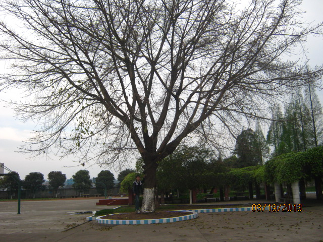 学校里最高大的一棵树,是花园边和教学楼遥相呼应的黄角树。据老师们讲,这棵树是2003年建校的时候才有的,当初还只有一层楼那么高,现在快有五层楼高了。