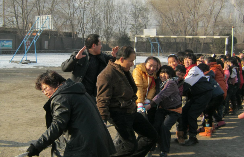 三八妇女节前一天,老师们来了一场拔河比赛。 比赛场上宋老师队的队员们严阵以待,看样子是非赢不可,而周老师队也毫不示弱,个个显的盛气临人,大有强者风范。而学生们各年级组成的啦啦队,都在为自己的任课老师啦喊加油。比赛开始了:"加油!加油!宋老师加油、加油......"这震耳欲聋的声音是我们五年级的同学们为宋老师助阵。我们这群天真烂漫的孩子,欣喜若狂的欢呼着,啦喊着,比赛正在僵持着,两队不分上下,一会儿拉到这儿,一会儿又到这边,老师们正在努力"战斗",而我们都希望自己的任课老师能赢,周老师班的学生都在那边又跳又喊,我们也不示弱,又卖力地喊起来,喊声此起彼伏,"加油...加油..."