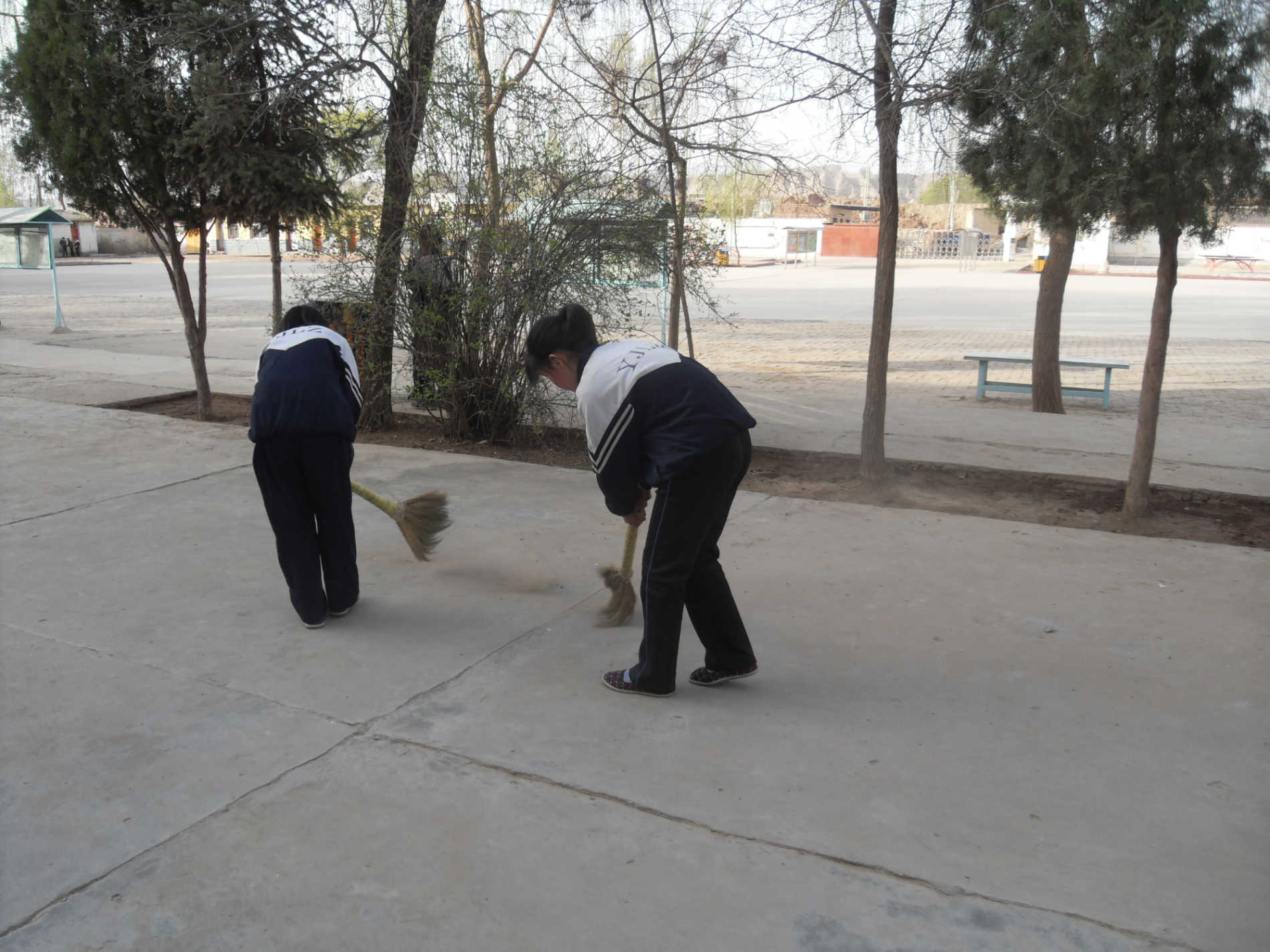到达各自的"地盘"之后,拿起扫帚就开始奋斗,不一会儿校园就被弥漫的灰色的尘雾笼罩了,同学们戴上帽子,仍然志气高傲的扫着,不一会儿,本来脏兮兮的地面就被同学们扫的干干净净了。