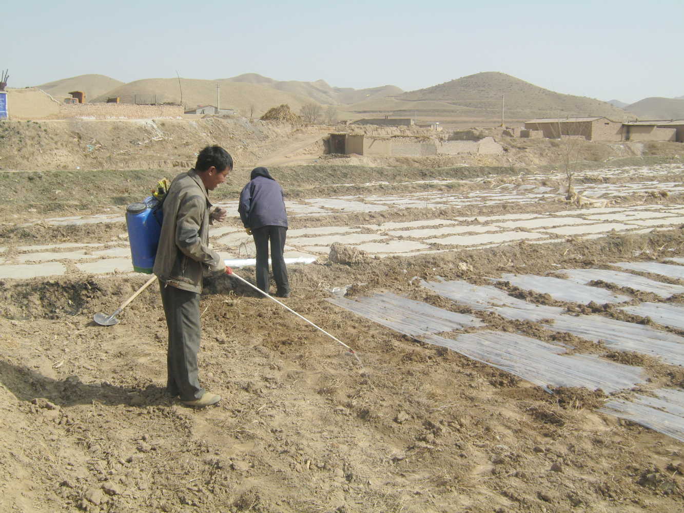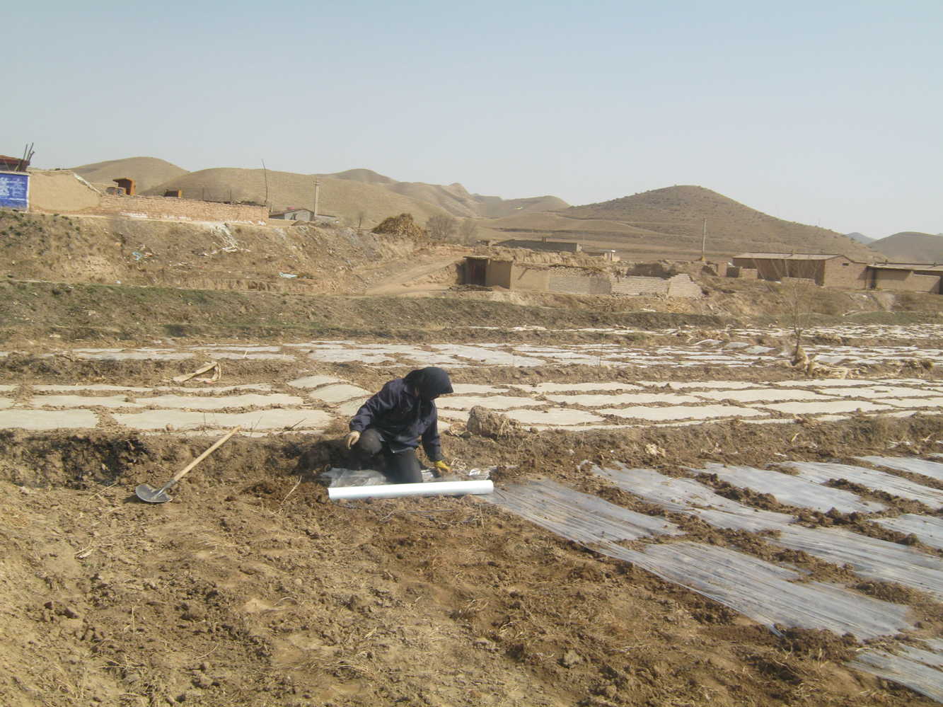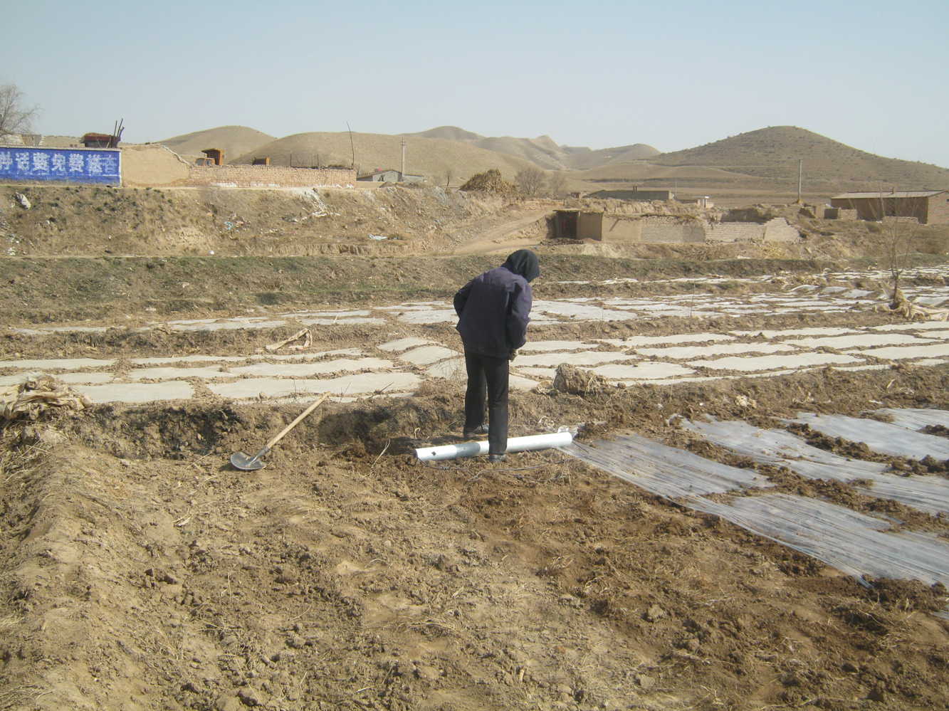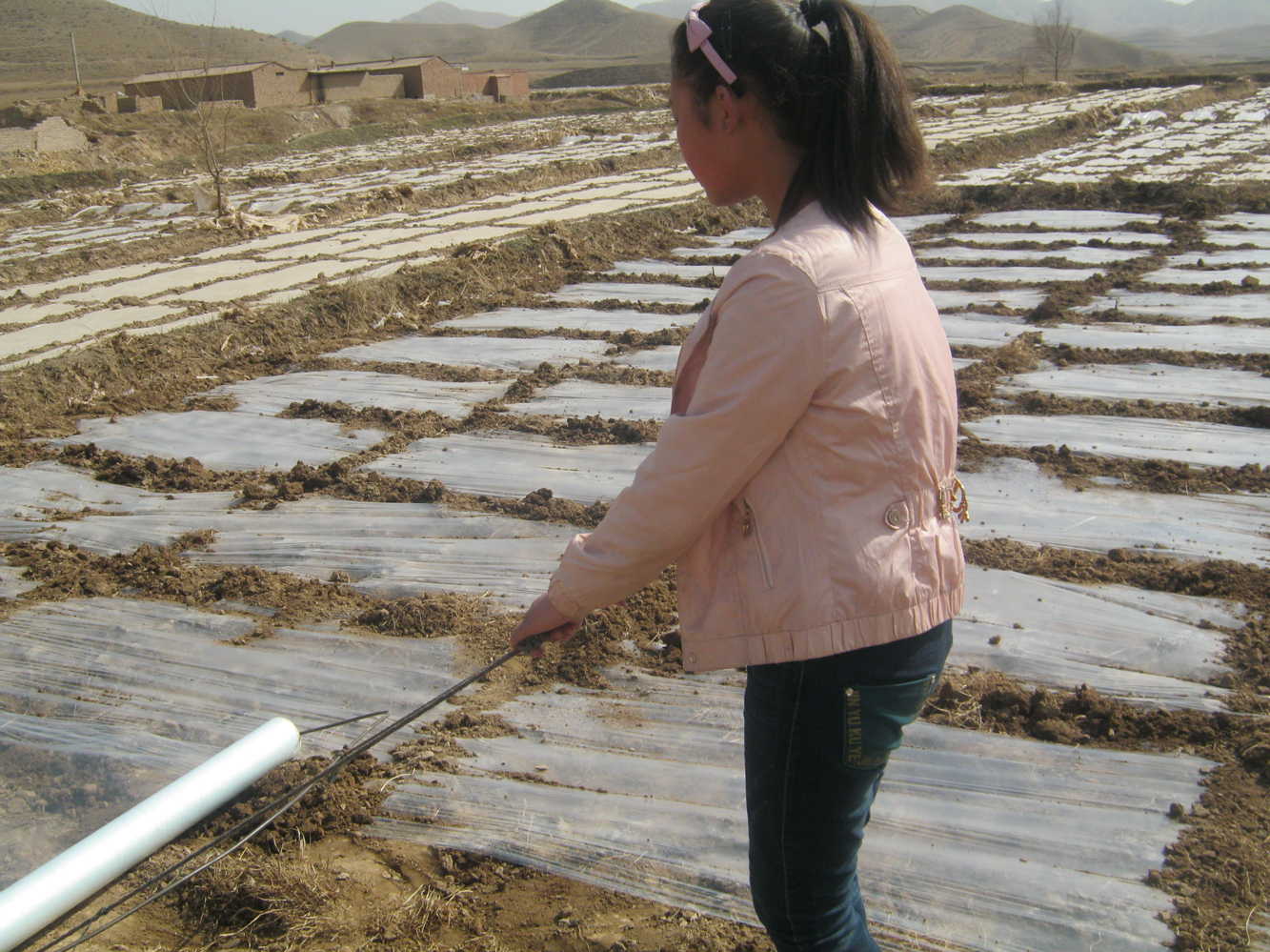 今天我们几个人去地里绷地膜(把地膜蒙在地上让太阳晒出温度),再过两周就可以种玉米了。以前我根本没有干过农活,就算是干也就是一小会觉得也没什么难的。但今天我们干了整整一天,绷了两块地的地膜,我这,才真正体会到了什么叫面朝黄土背朝天了。