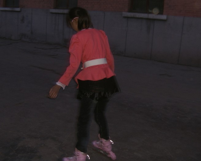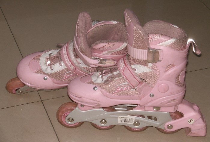 今天爸爸给我买了一双旱冰鞋,它全身都是粉红色的,鞋尖圆圆的,它下面有一排整齐的鞋轱辘,右脚后还有一个刹车我非常喜欢它。但是,它太小了,我根本穿不上,这下可怎么办呢?这会子就该请教一下鞋后跟上的放大螺丝钉了。放了一个号后我穿上旱冰鞋,开始了我的学滑旱冰之程。